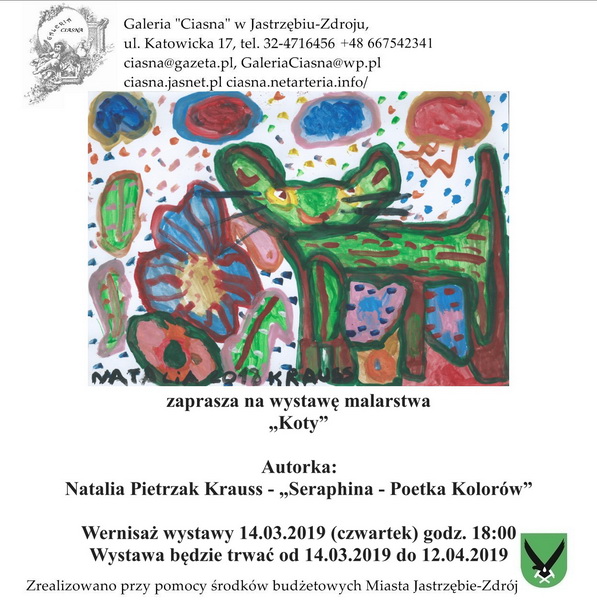 Wystawę „Koty” Natalia Pietrzak Krauss prezentuje pod nowym pseudonimem Seraphina - Poetka Kolorów. Wystawa odbędzie się w Galerii „Ciasna” w Jastrzębiu-Zdroju w marcu 2019 roku.