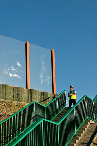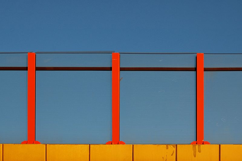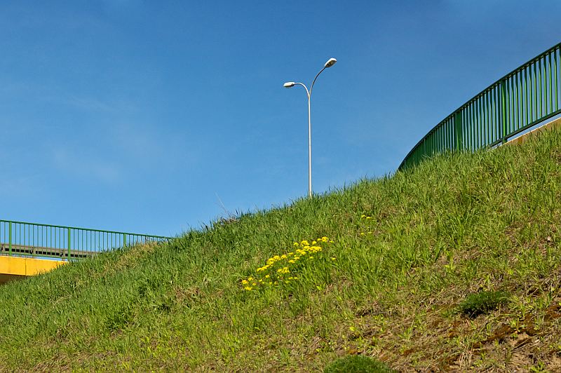Raz jest to centralnie umieszczona latarnia uliczna „wyrastająca” z wąskiego pasa intensywnej żółci, albo intrygujący zielenią prostokąt drogowskazu pomiędzy linearną strukturą mostu.