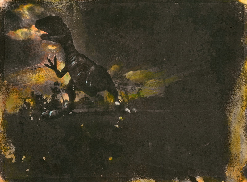 Cykl „Dinosaur Jr”. Zdjęcia wykonane są pierwszą techniką pozytywową na świecie, kalotypią i barwione akwarelami.