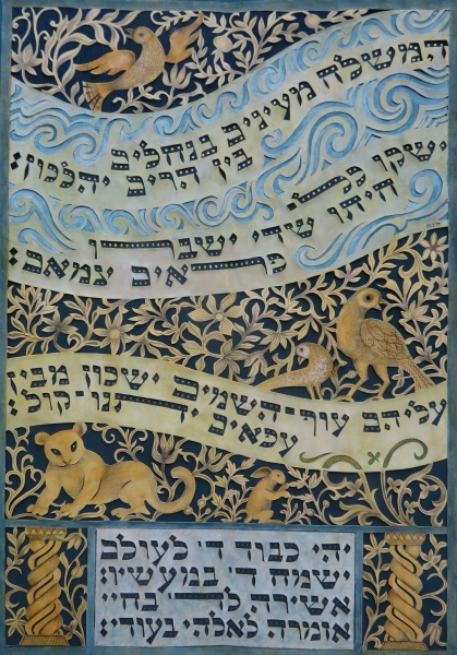 Aszkenazyjska jest jak izba, gdzie matka piecze chałę ─ tam gwar w jidysz, „matczynym języku”. Uczucie, naiwność, nie są słabością, nie trzeba się ich wstydzić. Kot mruczy ─ raczej ryczy ─ bo to lew domowy, na potrzeby wycinanki. Ptak dziobie ziarno ─ i oto już jego dziób trzyma szarfę ze słowami psalmu. Kwiat ręką matki siany ─ oto Drzewo Życia. Ileż barw, jak tu ciepło, nawet błękit grzeje.