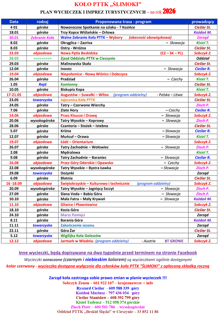 Wycieczki Koła PTTK "Ślimoki" - 2026