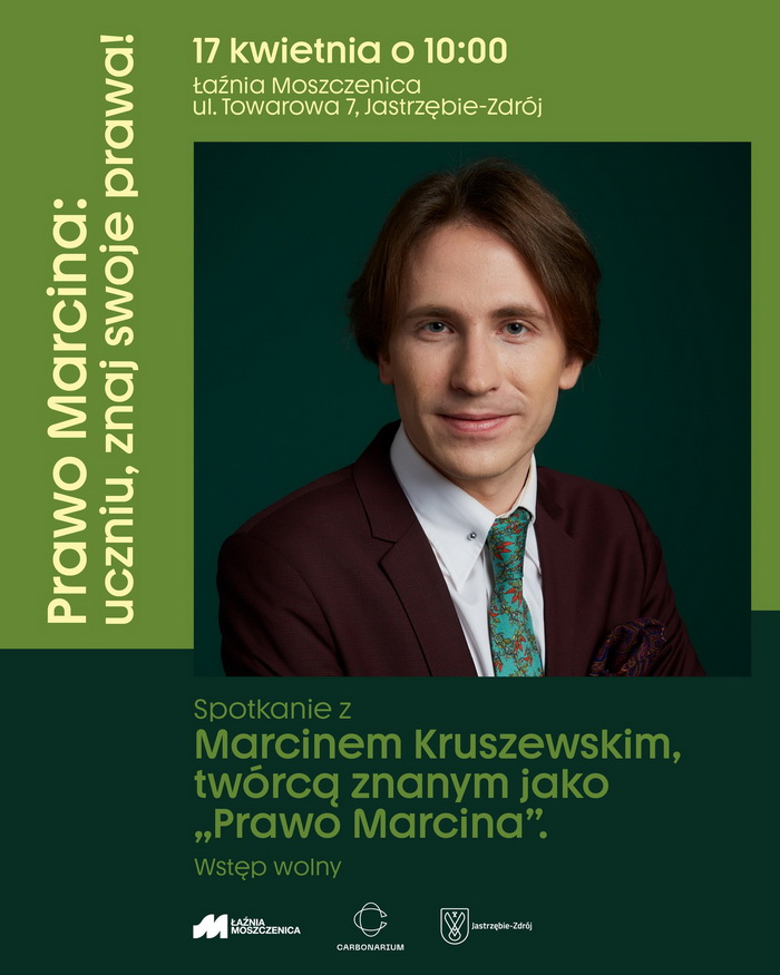 17 kwietnia o 10:00 w Łaźni Moszczenica (ul. Towarowa 7, Jastrzębie-Zdrój) odbędzie się spotkanie z Marcinem Kruszewskim – prawnikiem i jednym z najpopularniejszych twórców edukacyjnych w polskim Internecie (Prawo Marcina).
